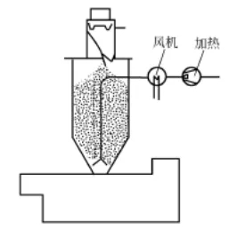 在擠出機料斗上直接安裝熱風式干燥器,如圖1所示。原料由供料系統自動加料至料斗內,加熱器加熱的熱空氣由風機從料斗底部強制吹過原料,從而使原料得以干燥。料斗熱風式干燥機所送入的熱空氣在受到潮濕氣候的影響下含有一定的濕度,這種濕氣在送入干燥器前就應排除,通常采用讓空氣通過硅膠除濕劑的方法來吸附空氣中的濕氣,從而提高了干燥器的效率,使干燥時間減少約50%。
