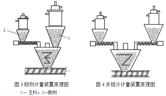 助劑計量裝置。如圖3所示。該計量裝置中主要原料1不經計量,直接進入料斗,助劑2經計量螺桿3進入料斗。似乎主料1是不經計量的,而實際上在生產時由于擠出機的料流是以恒速流動的。因此助劑2將根據擠出機的產量按比例加入,加入量是通過改變計量螺桿的轉速來實現的。料斗中的混合料經料斗攪拌器攪拌后進入擠出機,如果需配入多種助劑,將增加螺桿計量裝置數量。多組分計量裝置。助劑和主料均都需要計量,計量裝置與擠出機無關。如圖4所示。各計量比由計量螺桿的轉速或料筒的大小來決定。
