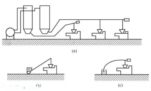 氣力輸送系統。氣力輸送系統主要有壓送式和吸引式。壓送式上料裝置是由一臺鼓風機送出的壓縮空氣以0.2~0.6MPa的壓力將原料吹入管道中,再經設在料斗的旋風分離器后,進入料斗內。這種方式僅適用于顆粒料的輸送。吸引式上料裝置是由引風機在料斗中形成的負壓,將卸料閥自動關閉,同時吸入原料至料斗中,一旦料斗裝滿,引風機即關閉,此時原料靠自重將卸料閥開啟流入大料斗中,如此完成一個進料周期,進行多次重復以上動作,直至大料斗裝滿,卸料閥不能開啟為止。上料過程通過監視報警裝置能周而復始地自動進行。這種方式適合輸送顆粒料,也可以輸送粉料。這兩種方式都能組成單機上料系統和多機上料系統。單機上料系統是每臺擠出機設置獨立的輸送管線;多機上料系統用于多臺擠出機的同種原料的輸送,共用一個氣源,可設置控制中心,實現群控操作,并由微機對各臺數據進行處理。