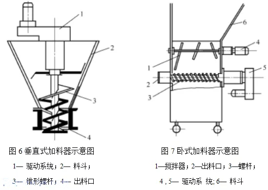 強制加料器可分兩種,即垂直式加料器和臥式加料器,如圖6和圖7所示。加料器用直流電動機驅動,并設置過載保護電路,當料流壓力增大或進料口堵塞時,不至于損壞加料器。垂直加料器進料螺桿在進料口處呈錐形,通過調整軸向間隙,輸送不同體積密度的原料,輸送量較高。臥式加料器輸送量較小,可兼作混料和儲料,只適于安裝在單螺桿擠出機上。