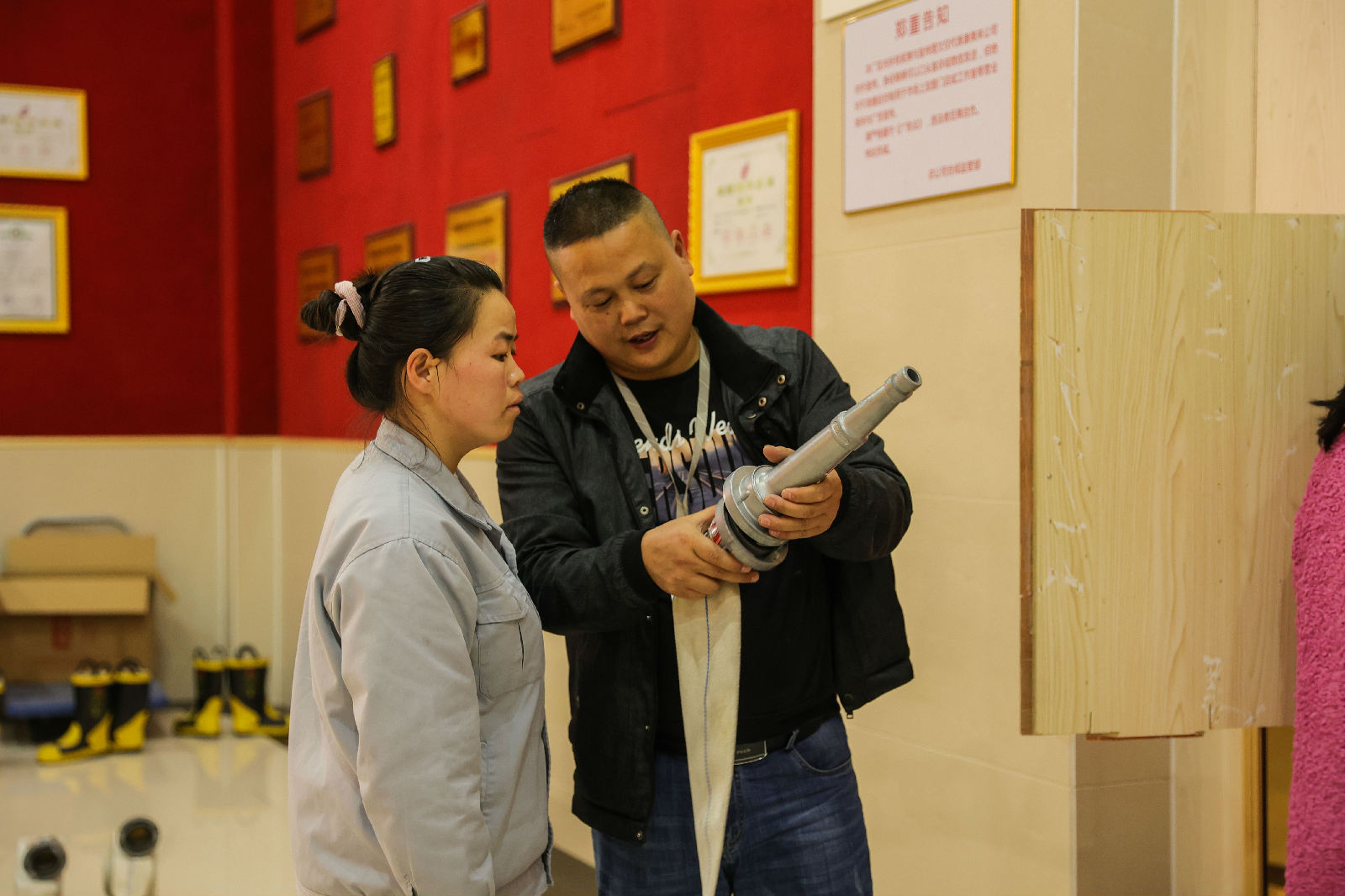 隨后,參與活動(dòng)的干部職工在引導(dǎo)員的帶領(lǐng)下,從會(huì)議室按規(guī)劃路線疏散至一樓展廳,并井然有序的完成疏散撤離演練。并進(jìn)行消防水帶連接、水槍滅火、滅火器使用的一系列實(shí)戰(zhàn)操作,牢牢掌握消防器材的使用方法和技巧。