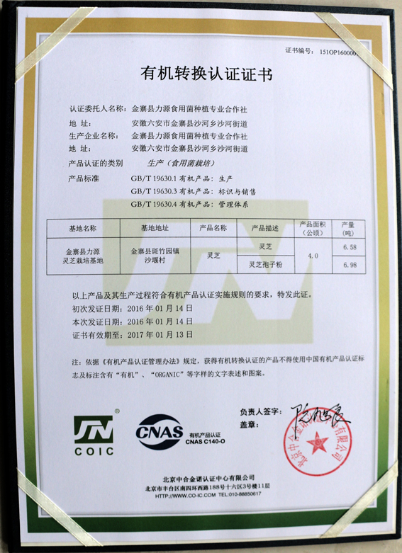 康美來公司高度重視產(chǎn)品源頭藥材基地建設,要求旗下合作社不打農(nóng)藥不施化肥,有機種植。2016年,康美來旗下合作社——金寨縣力源食用菌種植專業(yè)合作社種植的靈芝及靈芝孢子粉通過了有機轉(zhuǎn)換認證(證書編號:151OP1600007)。
