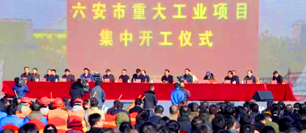 2017年12月24日上午,六安市委市人民政府召開全市重大工業投資項目集中開工儀式。安徽省委常委、六安市委書記孫云飛、六安市人民政府代市長葉露中、市人大主任王勝、市政協主席付新安、市委常委、統戰部部長、市開發區管委會主任王琦、市委常委、副市長束學龍等領導出席主會場開工儀式。