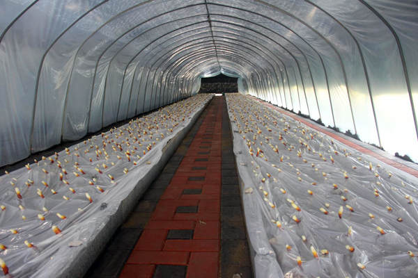 早期栽培的靈芝已長出嫩芽,色澤鮮艷,整齊排列,迎接遠(yuǎn)方的客人。