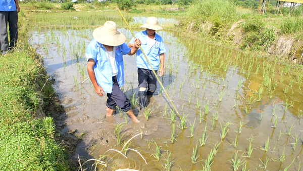 突然,我們看見一群農(nóng)民“傻乎乎”站在稻田里,每人手拿一個桿子,腳在地上不斷地游動,讓司機把車子停下來,我們一探究竟。