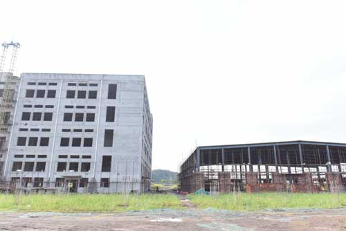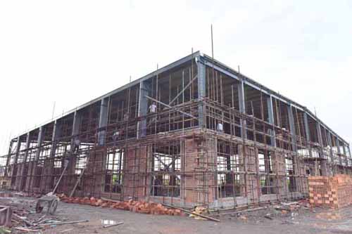 然后余董進入正在建設的第二幢廠房培訓中心。培訓中心鋼結構廠房目前正在墻面施工中,工人們正在壘磚砌墻。