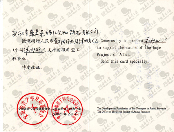2008年6月,康美來公司通過安徽省青少年發(fā)展基金會、安徽省希望工程辦公室向安徽希望工程事業(yè)捐贈善款16943元,用于支持貧困地區(qū)基礎(chǔ)教育事業(yè),幫助貧家子女走進(jìn)課堂,成就夢想,讓落后地區(qū)擁有更多更好的學(xué)校和教學(xué)設(shè)施。